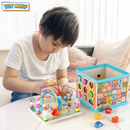 Alphabet Learning Toys Wooden Bead Box – 5 in 1 Activity Cube